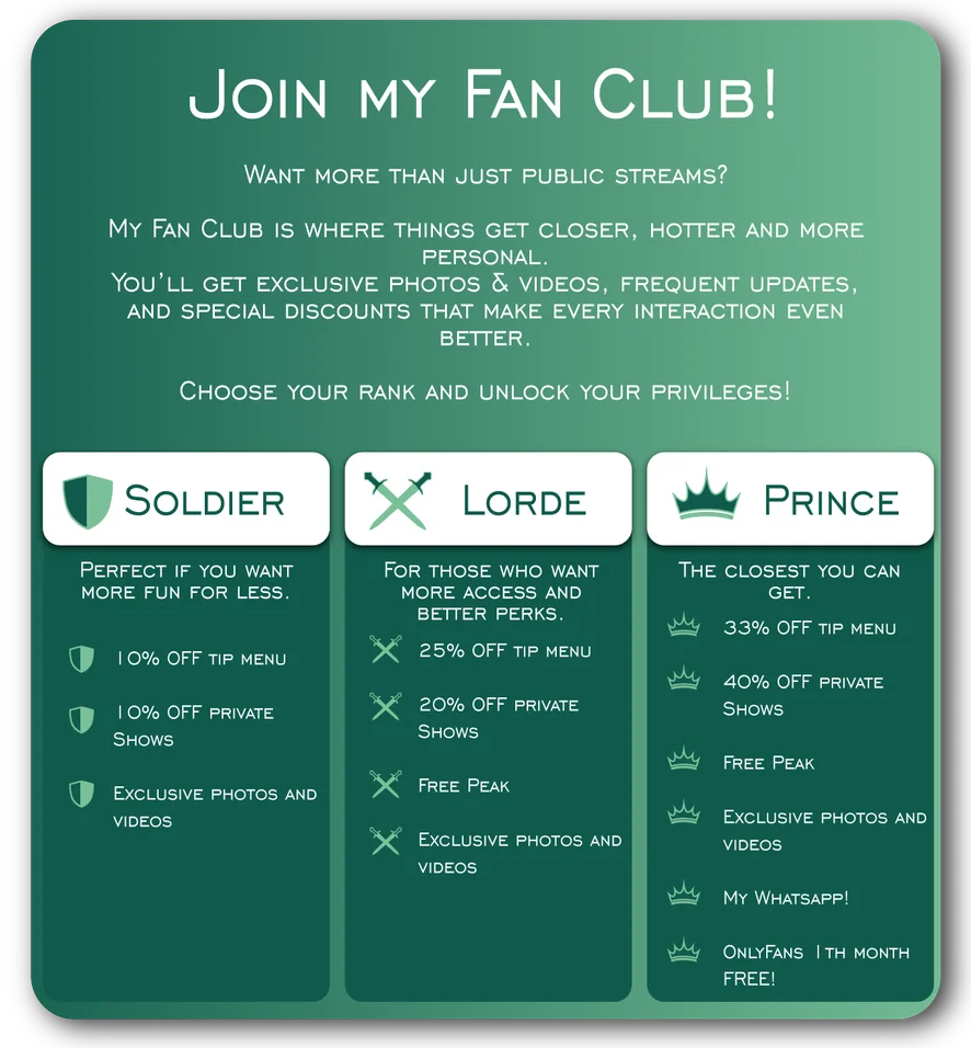 ডগি স্টাইল, বীর্যপাত, গিলে ফেলা, ফ্ল্যাশিং, ফুট ফেটিশ, হস্তমৈথুন, ফিঙ্গারিং, হ্যান্ডজব, স্ট্রিপটিজ, পুরুষাঙ্গের রেটিং, কাম প্লে, ইরোটিক ড্যান্স, কামশট, ফেসিয়াল, হস্তমৈথুনের নির্দেশিকা, অর্গাজম, স্প্যাঙ্কিং